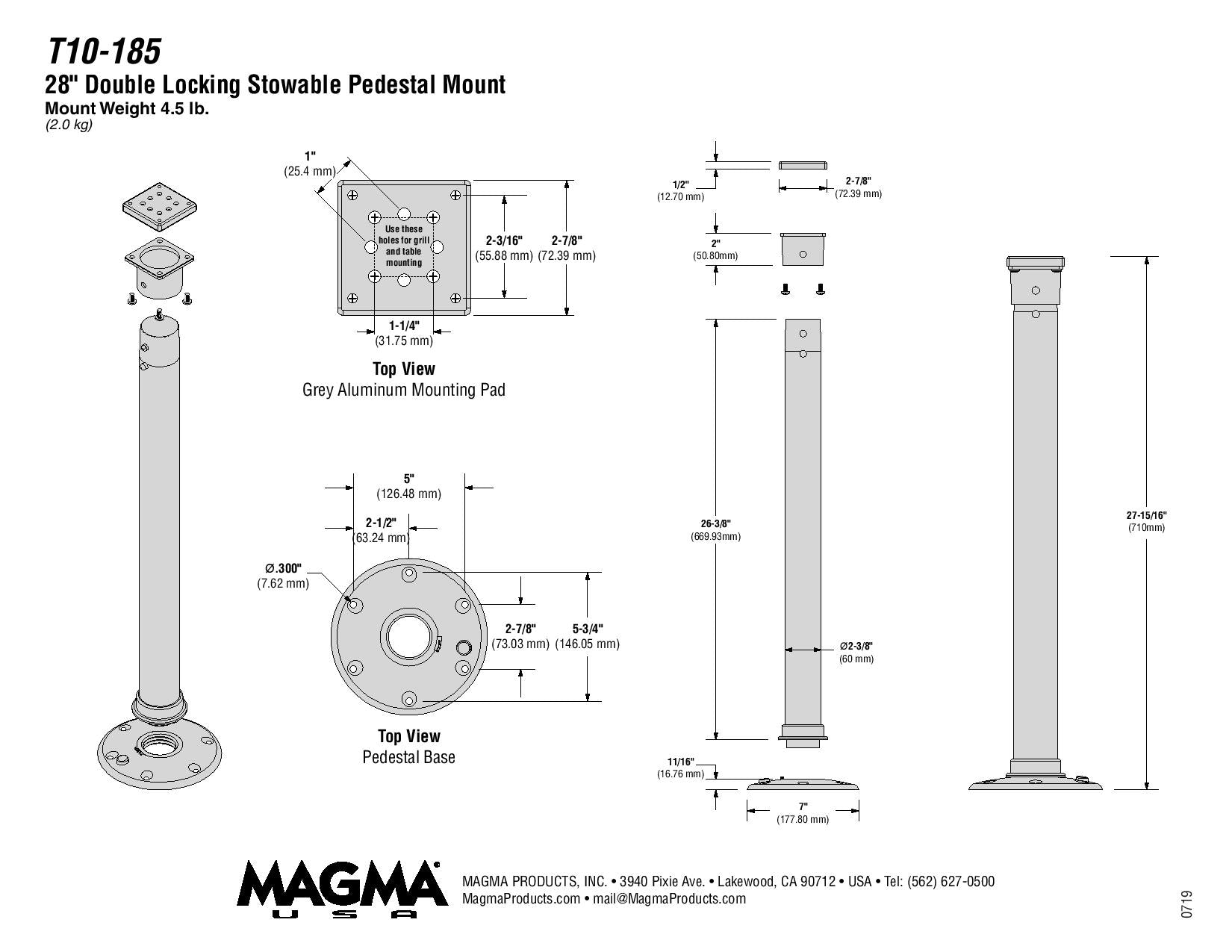 Magma’s 28” locking pedestal mount for rectangular grills and single mount filet tables has a double locking mechanism that insures a secure fit for your boat or home application. This double locking, Silver metallic anodized Aluminum, pedestal post locks into the surface mounting base and grill mounting bracket with (2) single push-buttons; allowing the entire assembly to be instantly installed or removed and stored for convenience. The low-profile threaded twist-lock surface mounting base has been designed with a flush bottom so there is no need to cut a hole in your deck and measures just 5/8" tall and 7” diameter with a 5-3/4" bolt pattern. With its versatility and convenience this is the perfect mounting option for boat swim platforms, boat decks, pontoon boats, or at home on the patio, balcony or deck.