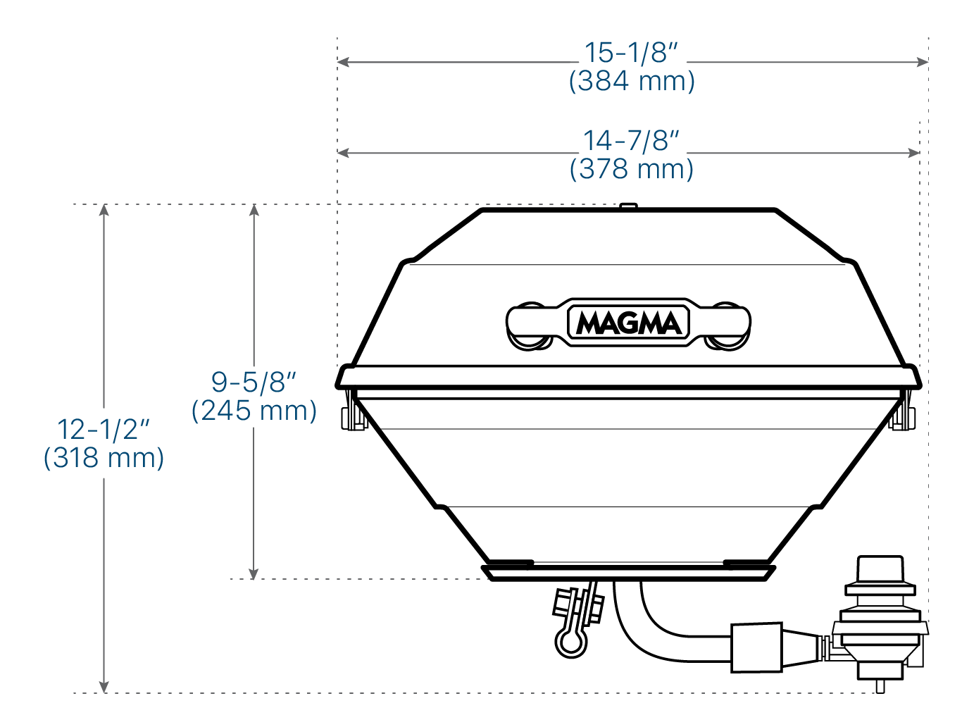 This grill was designed for economy without sacrificing functionality. Made of 100% 304 mirror polished stainless steel, it will give you the safety, durability and performance required of a marine grill. It uses our time-tested, highly efficient radiant plate heat distribution system in conjunction with convection heating technology to achieve hot, even temperatures while using a minimum of fuel. It comes to temperature very quickly and is great for searing steaks or just grilling up some burgers and dogs. The patented swiveling turbo venturi tube allows you to adjust the control valve inboard, outboard, left or right wherever it is most convenient to you. The turbo venturi tube in combination with the newly designed burner virtually eliminates blow-outs. The control valve/regulator uses standard, disposable 1lb. propane fuel canisters, allows for quick, safe fuel canister exchanges or easily adapt to existing on-board LPG (propane) or CNG (natural gas) fuel systems. The grill quickly disassembles without tools for easy clean-up. Magma offers the largest section of mounting options (sold separately) to customize the grill for your needs, fuel canister (not included). Serving shelf sold separately.