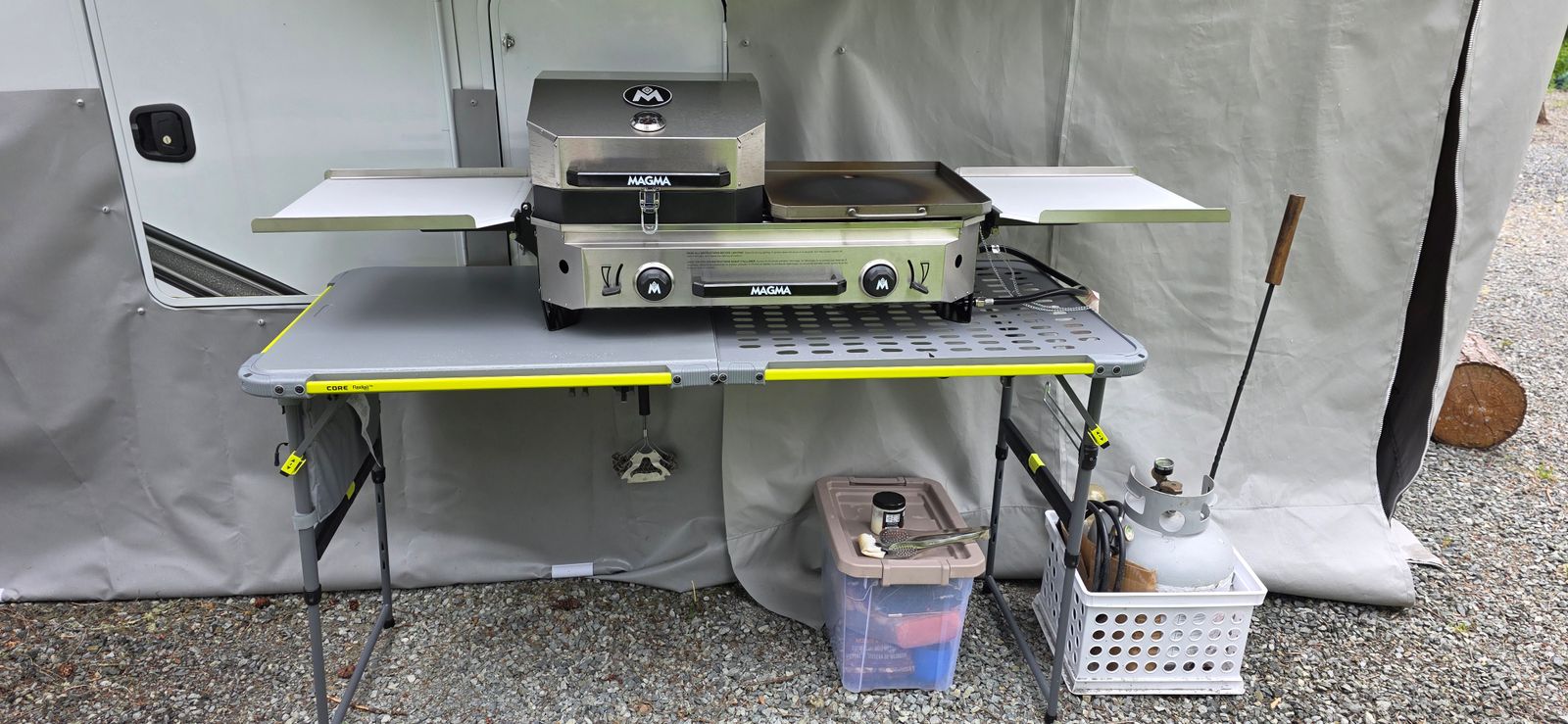 This Crossover Series Bundle comes with the Double BurnerΒ Firebox, powered by 2 x 15,000 BTU burners and works as a stand alone stove, and the Grill and Plancha. The Firebox and Grill Top are made with 304 brushed stainless steel and cast aluminum components. The Plancha is oil coated steel.Β The non-corrosive, cast aluminum base on the Grill Top prevents heat distortion to maintain a perfect fit with the Firebox.Β The Grill includes a unique diffuser plate to provide even heat across the entire cooking surface, funnels grease away from the burner into the Firebox grease containment system, and helps maintain temperature and control smoke.Β The lid includes a thermometer and locks into place for easy transport. The perfect outdoor kitchen combo for the foodie enthusiast to take on the road in the RV, wherever the adventure leads or for set up in a smaller backyard.