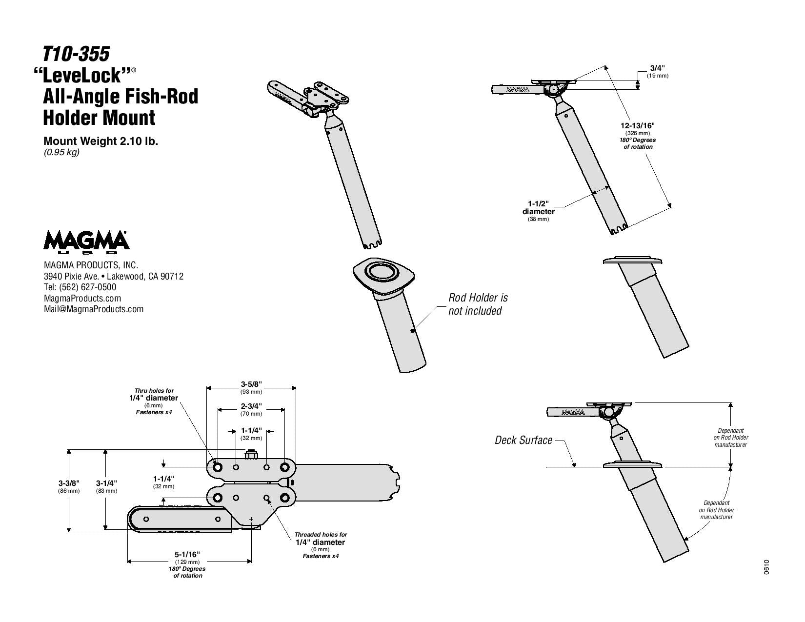 Magma's most popular LeveLock® fish rod holder mount is available in (4) additional pole lengths, in 6" increments up to 24" added to our standard length. This mount is constructed of marine grade Stainless Steel tubing and anodized Aluminum components. These components have been hard anodized to aircraft quality for extremely high corrosion resistance. With an increased adjustment range and sturdy draw tight handle design this heavy duty mount is the strongest, most corrosion resistant, and most versatile mount available on the market. These are custom made items, please allow for 2 weeks lead time to produce. Use with any Magma Rectangular Grill, Bait/ Filet Table, or Tournament Series Cleaning Station (sold separately). **Please note fasteners are not included with the mount, but rather are included with the Grill.