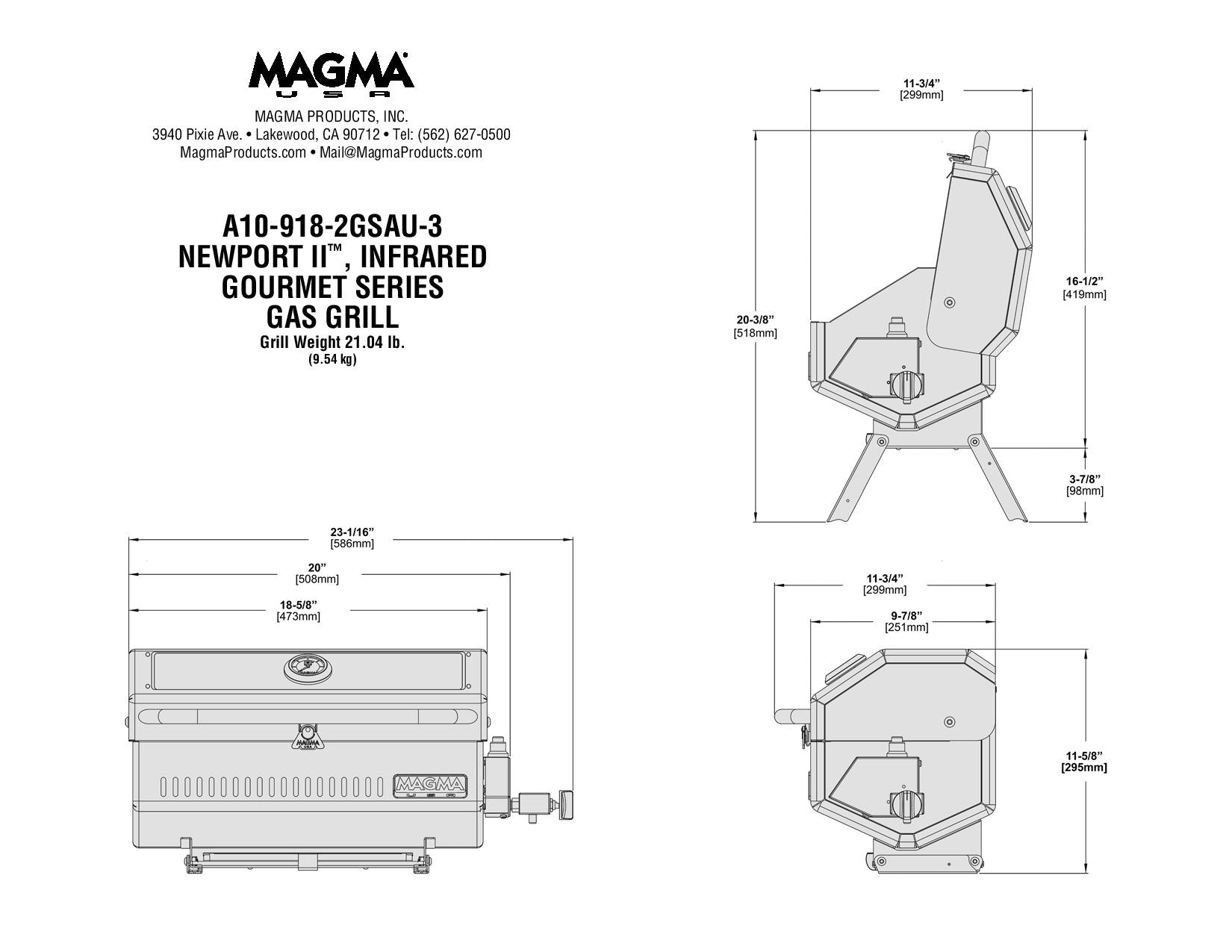 Magma's completely redesigned Newport II Infrared Gas Grill is a perfect addition for that perfect day on the water. New features include: an elegant exterior design, a completely redesigned combustion system that keeps the grill lit even in heavy winds, a hermetically sealed thermometer, a dependable electronic ignition system, powered by a single “AAA” battery (included), and an ultra high-temp glass viewing window. Anti-Flare Infrared technology produces intense, evenly distributed heat, eliminating Flare-Up and immediately emulsifies drippings giving your meal a great smoky flavor. Constructed entirely of 304 mirror-polished stainless steel to withstand even the harshest environments. Equipped with fold-away table top legs for go-anywhere use. Its fuel efficient swiveling control valve, attaches to pre regulated, low pressure propane (LPG) fuel systems or can be adapted for use with 1lb. disposable propane fuel canisters or natural gas (CNG) fuel systems. Magma offers the largest selection of mounting options (sold separately) to customize the grill for your needs. Serving tray not included.